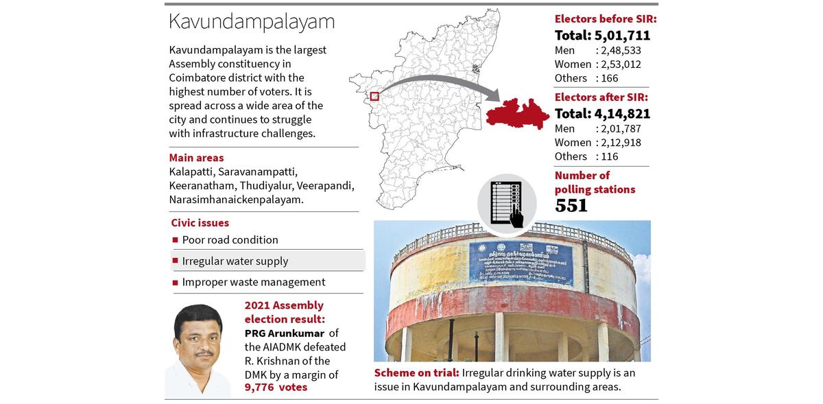 Kavundampalayam constituency in Coimbatore district, known for its high voter count, is facing significant infrastructure challenges as elections approach. Residents, particularly in the rapidly developing Kalapatti area, are calling for improved bus connectivity and better street lighting to accommodate the growing IT workforce. Local resident Preethi emphasized the need for enhanced transport options for newcomers to the city. Additionally, waste management issues plague areas like Idigarai and Narasimhanaikenpalayam, where ineffective collection leads to waste accumulation. M. Devendran, secretary of the Coimbatore district road protection committee, highlighted the poor condition of roads off the main Mettupalayam road, which are marred by encroachments and inadequate maintenance. Traffic congestion remains a pressing issue, particularly on the Mettupalayam road, despite the presence of flyovers. As the constituency prepares for elections, candidates from Congress, AIADMK, NTK, and TVK will need to address these pressing concerns to gain voter support.
