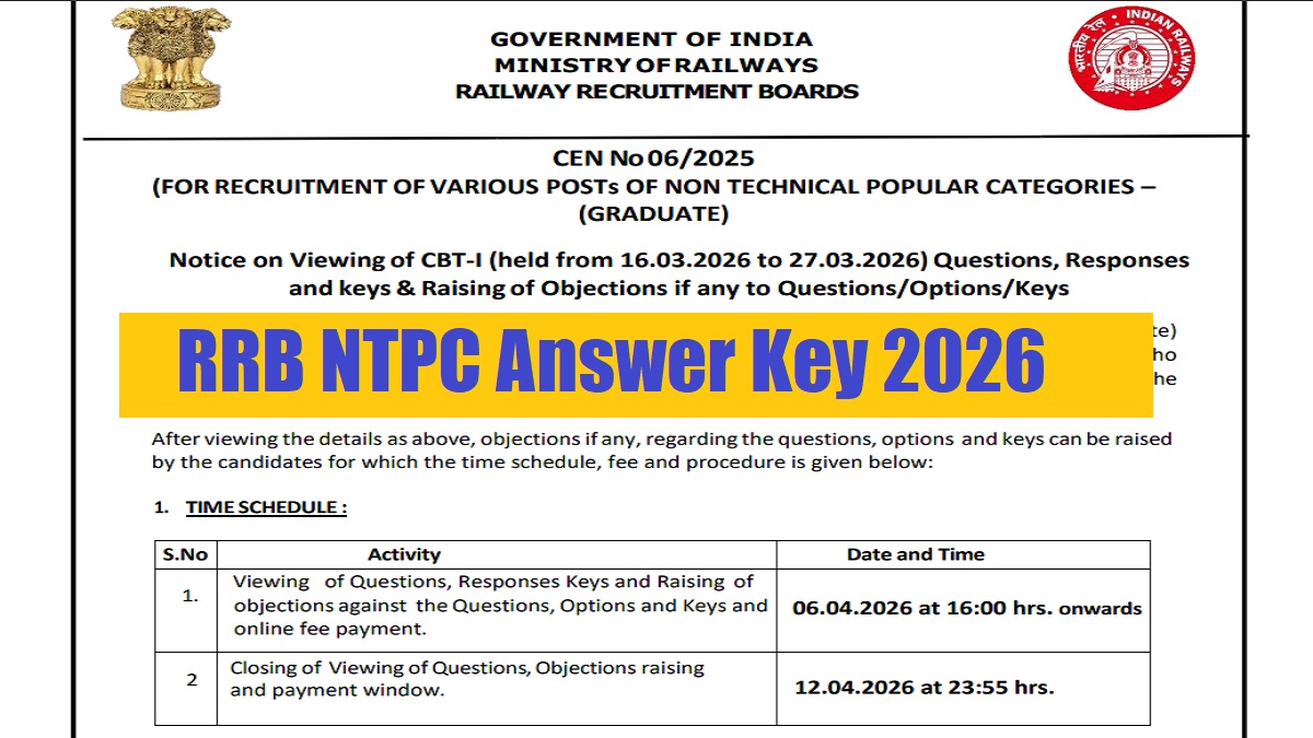 The Railway Recruitment Board (RRB) has released the answer key for the Non Technical Popular Categories (Graduate) exam under CEN No 06/2025 on April 6, 2026. Candidates can download the provisional answer key and response sheet from the official website rrbcdg.gov.in.
